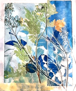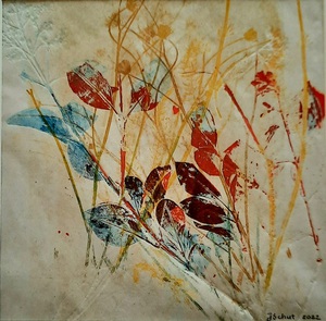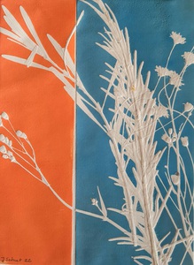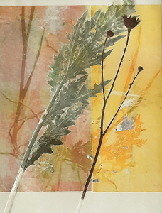 2022Violen. Afdruk, acryl met gellyplate en planten op papier.